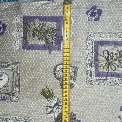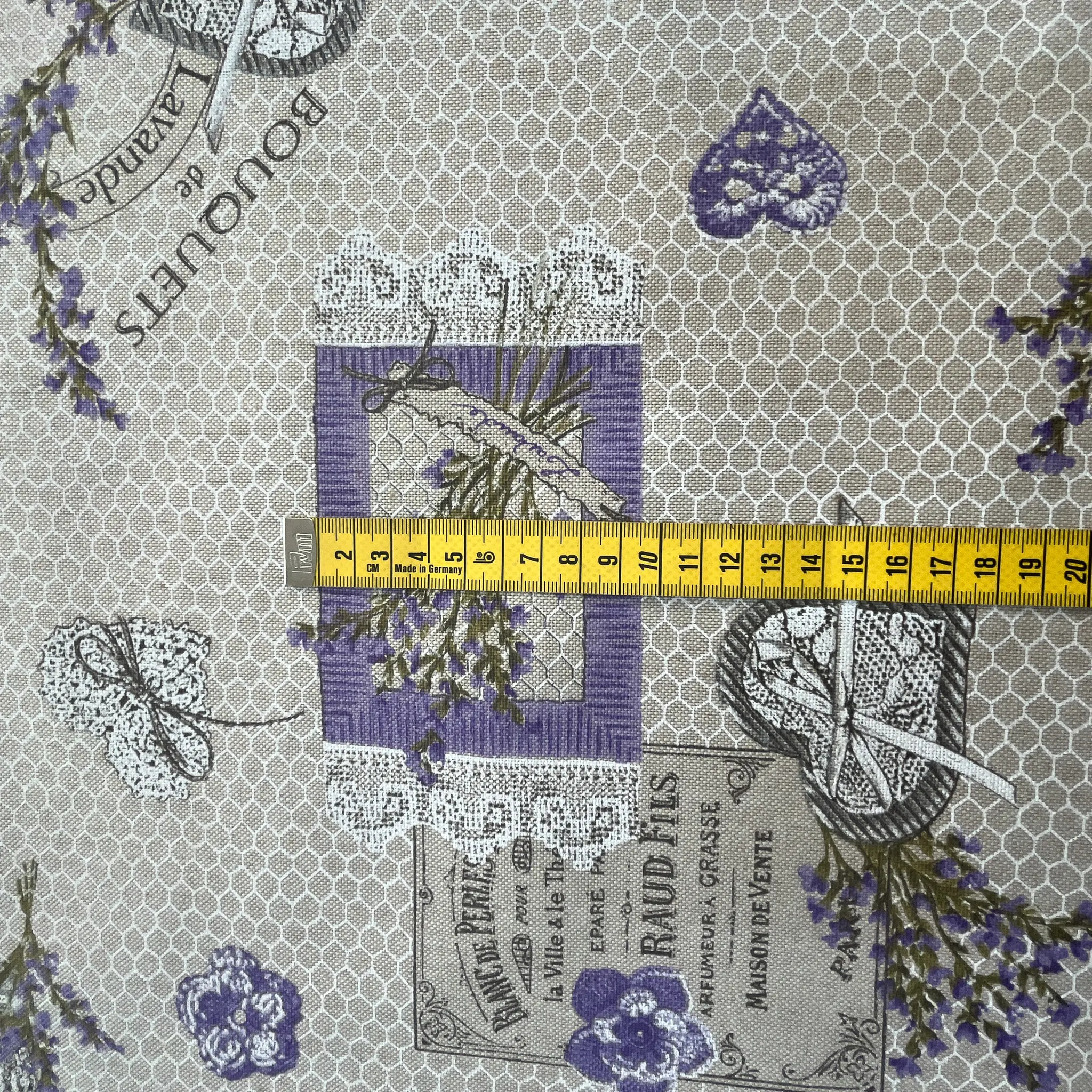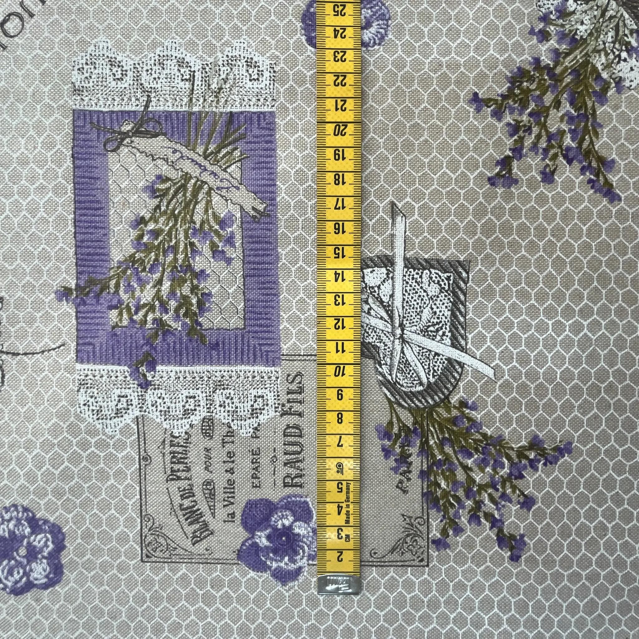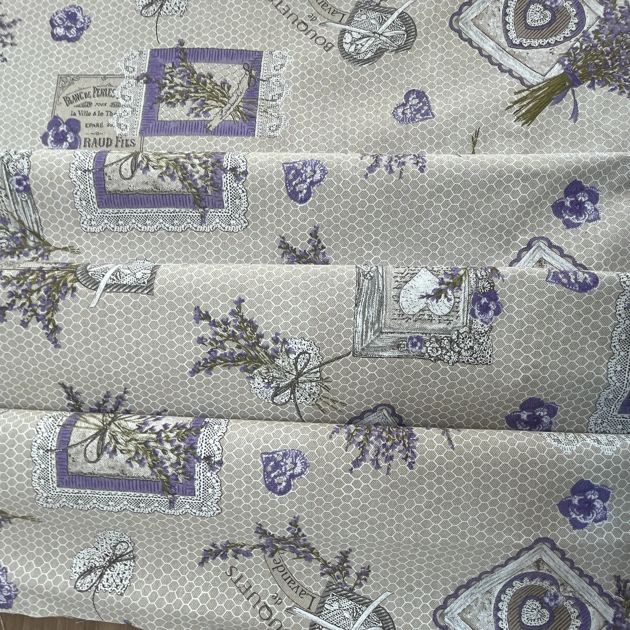 Il motivo è un all‑over in stile provenzale: mazzi di lavanda nei toni del lilla e del viola medio, con tocchi di verde oliva per i gambi, sono racchiusi in cornici rettangolari e quadrate effetto pizzo e finto ricamo, alternati a cuori, piccoli fiori stilizzati e cartigli con scritte francesi a tema “Lavande” e “Bouquets”.