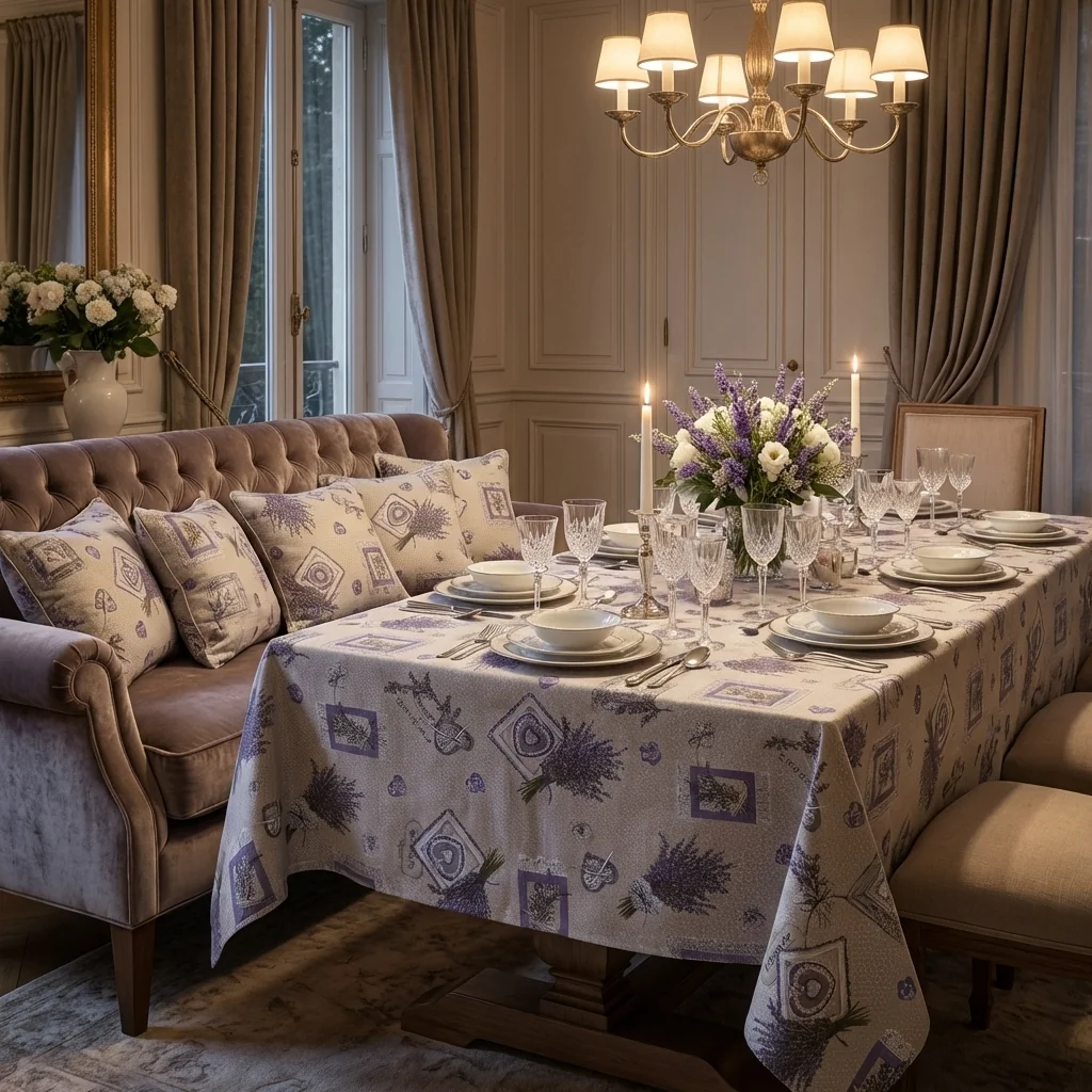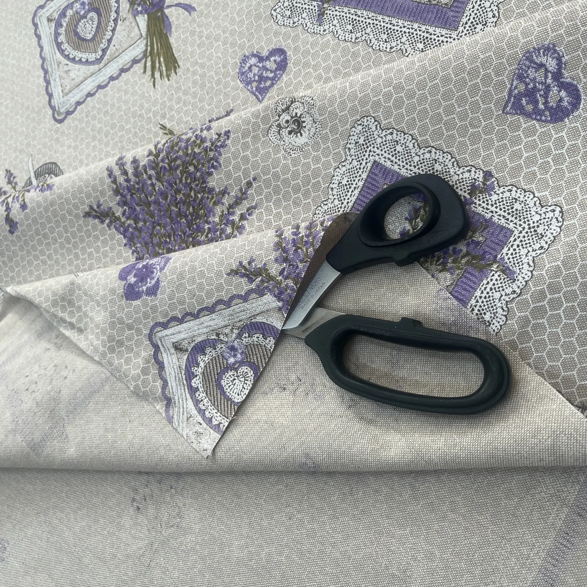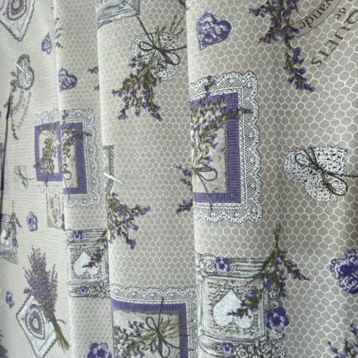 Il fondo neutro e i viola freddi fanno sì che il tessuto si abbini facilmente sia ad ambienti country‑chic sia a cucine moderne che vogliono un tocco romantico.