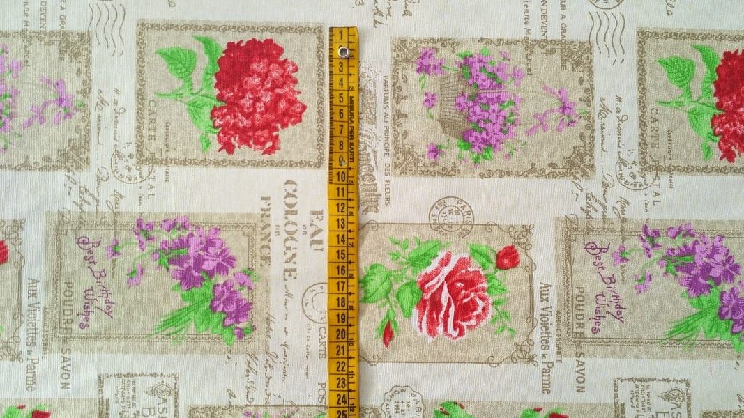 Versatile e multiuso, è utilizzabile per tovagliato, calate e cuscini. La fantasia floreale è arricchita da parole francesi che conferiscono al tessuto un’aspetto vintage e shabby chic.
